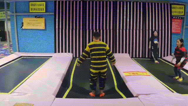 把自己穿成宛如一只蜜蜂站在蹦床上,助跑!前跳!上墙!借助蹦床的弹力,自己粘到魔术墙上,分分钟和条纹背景融为一体,还可以做出各种搞怪的姿势!